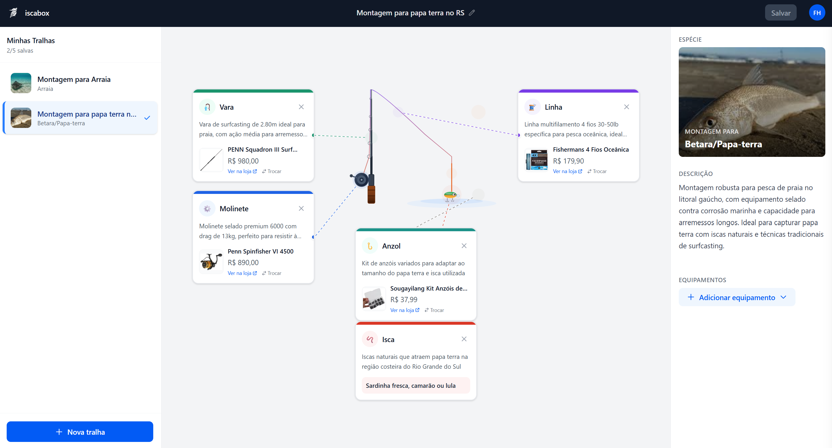 Diga qual pescaria quer fazer e nossa IA monta o equipamento completo: vara, carretilha, linha e isca.