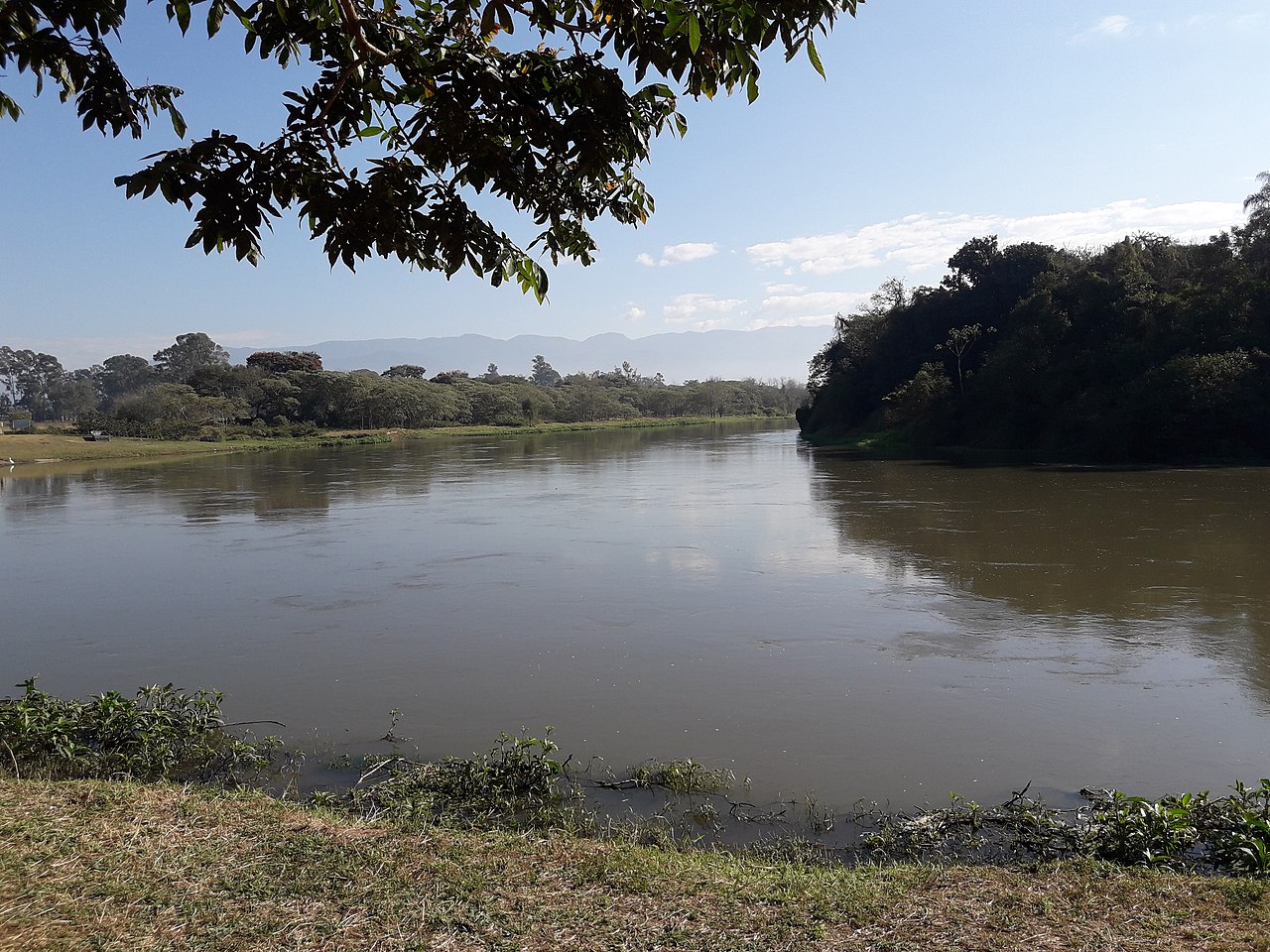 Rio Paraíba do Sul com a Serra da Mantiqueira ao fundo. Foto: Themium / Wikimedia Commons (CC0)